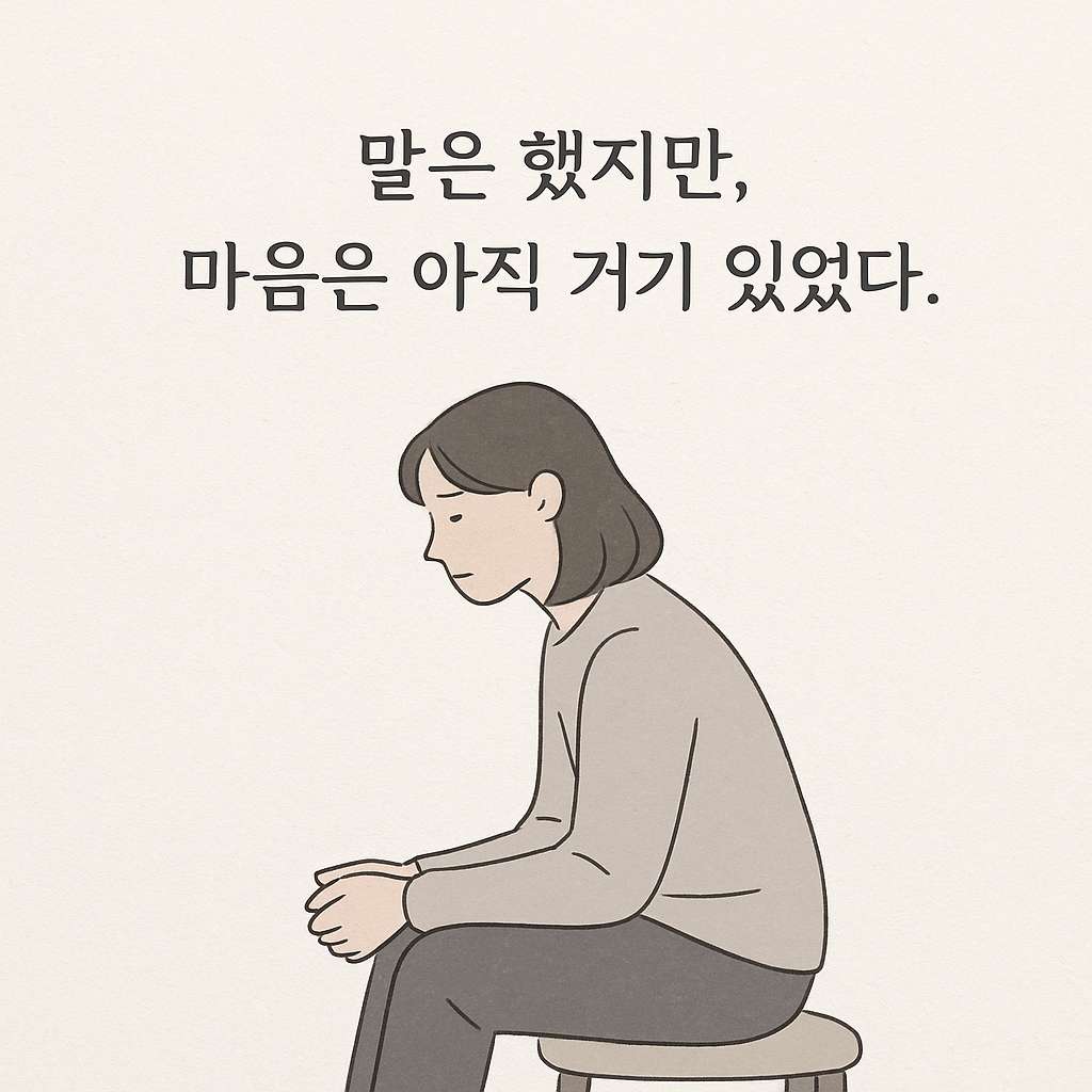 나는 감정을 말하는 편이다.불만이 있으면 말하고,서운하면 솔직하게 털어놓는다.돌려 말하지 않고, 웬만하면 참지도 않는다.그게 내 방식이고,그게 건강한 관계라고 믿어왔다.그런데도,말을 다 하고도마음이 안 풀리는 날이 있다.💭 말한 걸로는 충분하지 않은 감정들입 밖으로 꺼냈으니까어느 정도는 후련해야 할 텐데,속은 여전히 답답하고말을 마치자마자“괜히 말했나” 하는 후회가 올라온다.상대가 충분히 이해해주지 못한 것 같아서내 말이 너무 날카로웠던 것 같아서혹은,그저 내가 아직도그 감정 안에 머물러 있어서.🌫 말은 해결이 아니라 시작일 수도 있다감정을 말하는 건상대를 바꾸기 위한 행동이 아니라그저 내 마음을 꺼내보이는 일이다.근데 우리는 자꾸‘말하면 해결되어야 한다’는기대한 결과에 마음을 묶어버린다.말했으니까상..